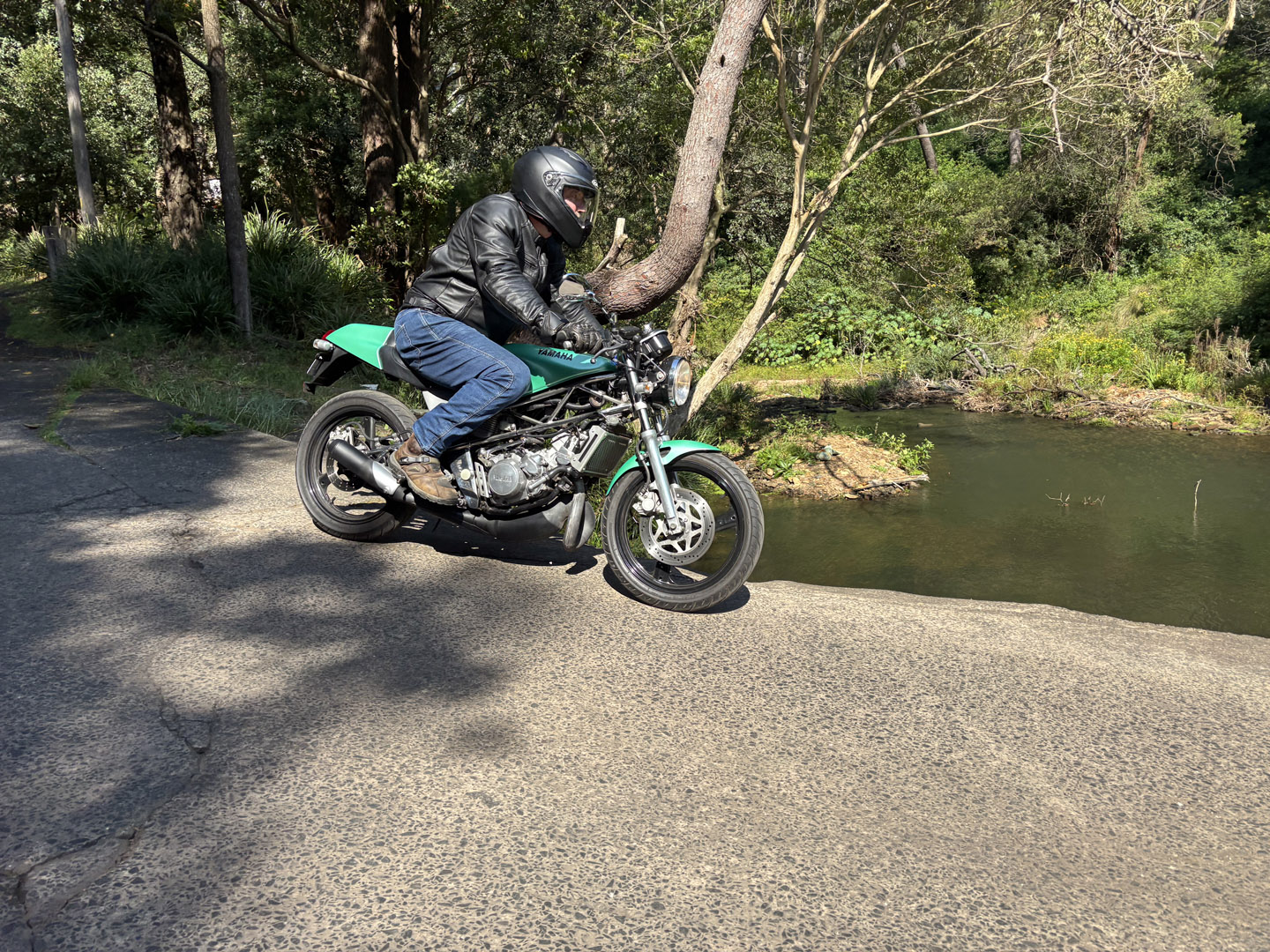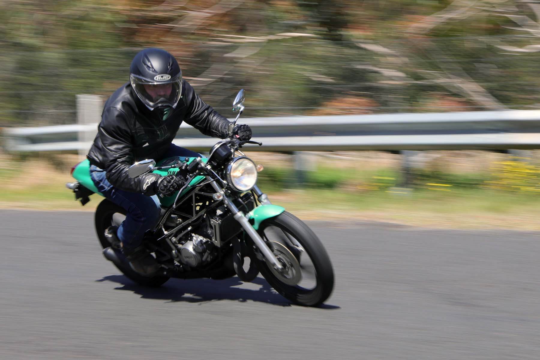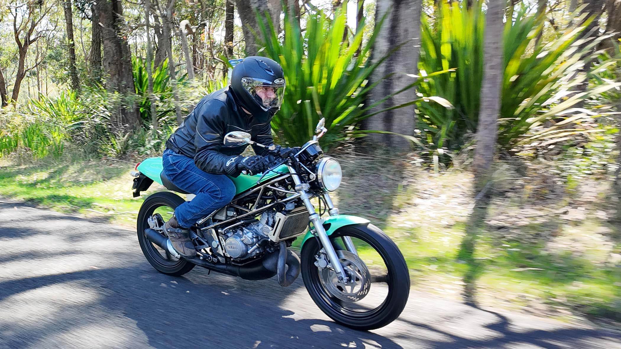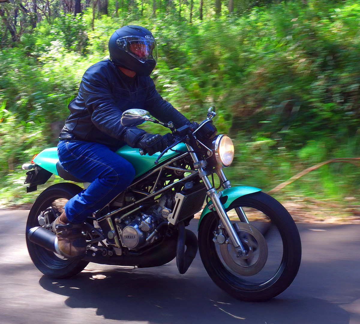 On the road, the SDR feels and handles as light as it looks. Pete rides it on local roads near home and occasionally through the twists of Sydney’s Royal National Park, where its agility comes alive. “It corners tight, feels incredibly light, and lets you really get low, especially on roads like the Royal National Park,” he says. Yamaha claimed a top speed of 100 mph, and while
