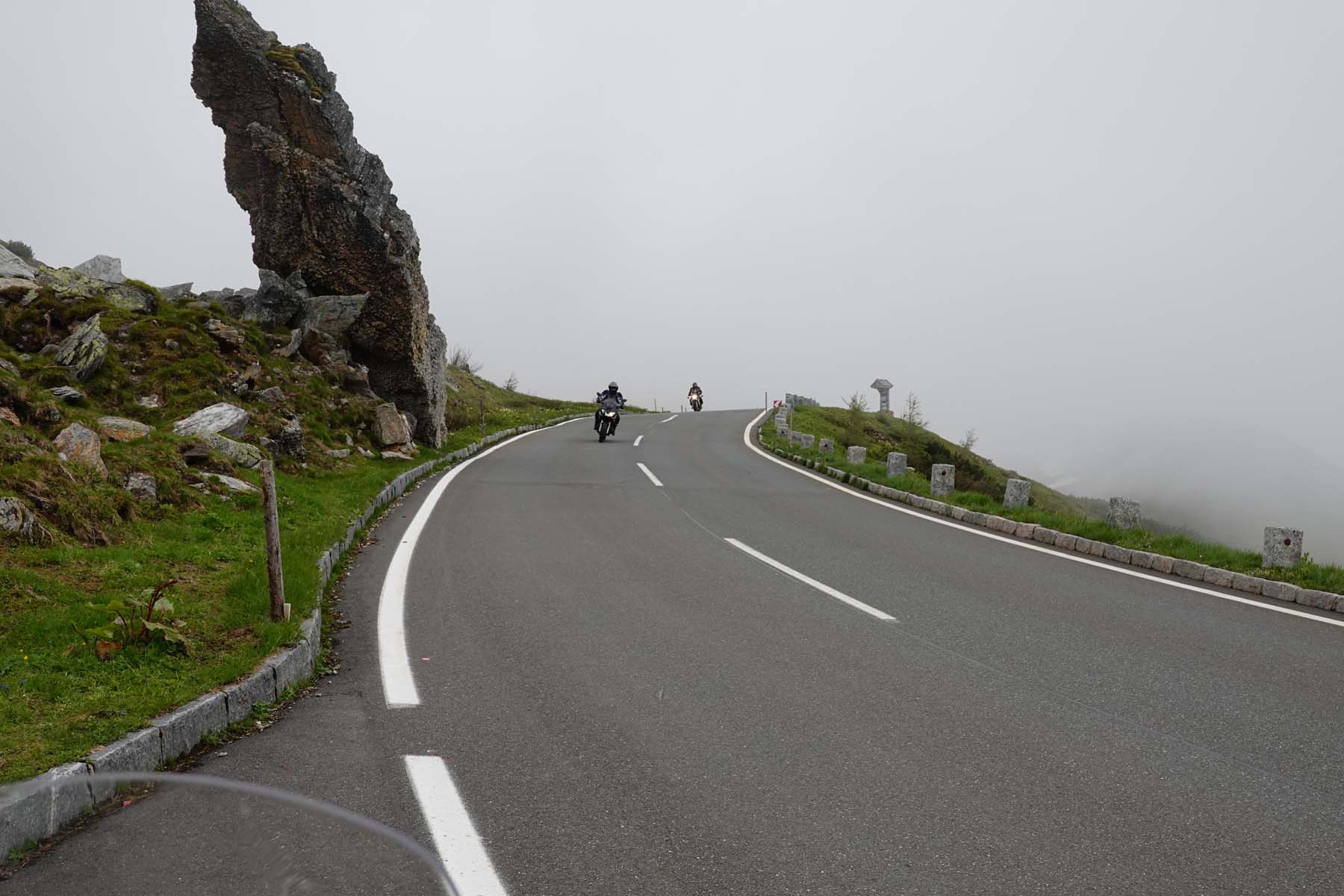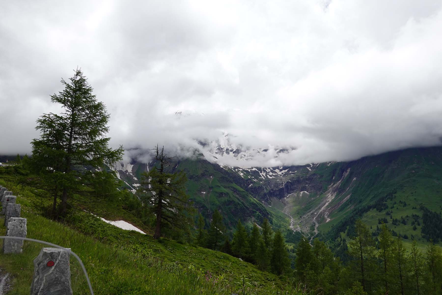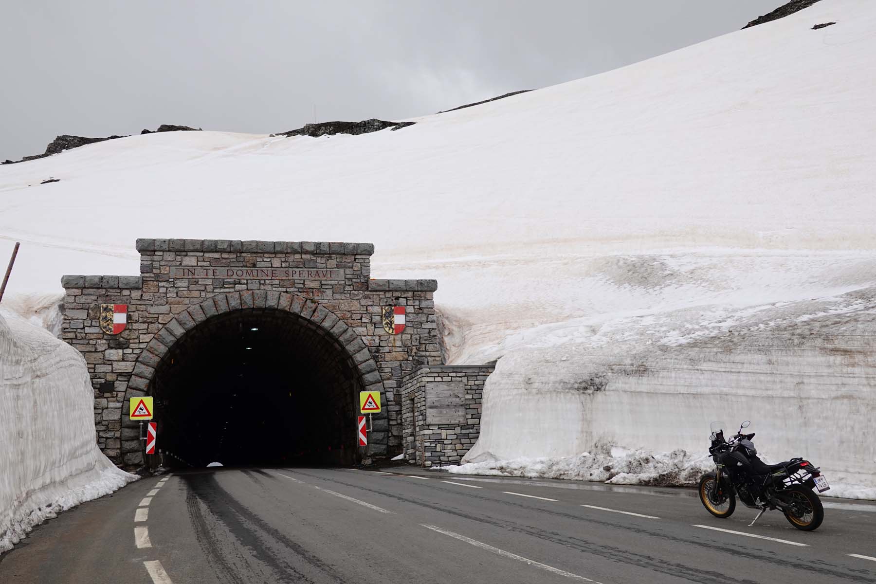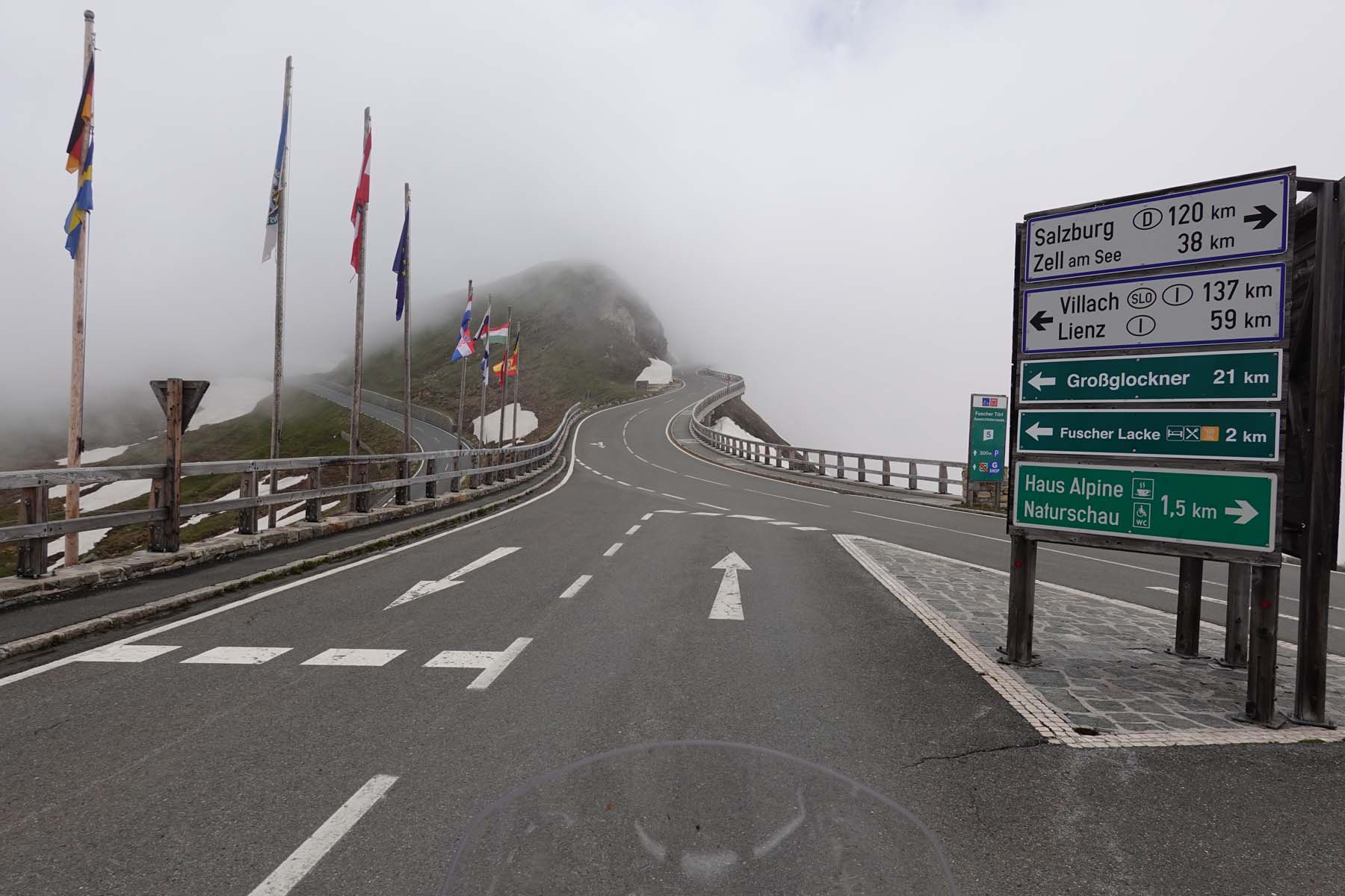 But the Grossglockner High Alpine Road is about riding, not parking. I didn’t even attempt to count the hairpins and gentler corners, but I can tell you there are a lot. Going south, as the road winds up out of the Fuschertal valley you first reaching the tree line and then the vegetation line before you find yourself in extensive snowfields. Two tunnels keep the road below major layers of snow.