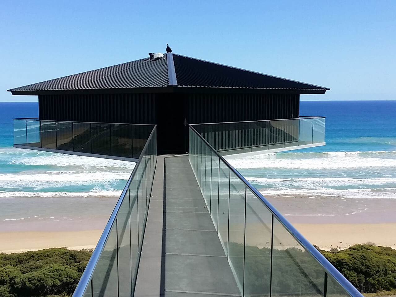 build process, replaced by a more contemporary structure. The new house has glass walls and doors that make up two of the property’s sides to maximise the view and privacy. But privacy is not something you get a lot of if you step out onto the wraparound balcony – almost every person that passes looks up at the house, and they usually wave. Access is via a long, narrow bridge which you can’t see once inside. It provides a bizarre feeling of floating above the coastline, amplified by the fact that the home does move around a little in windy conditions.